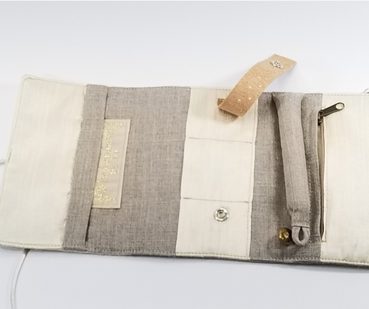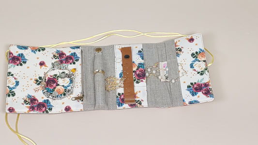 White & Gold Small Roses Travel Jewelry Roll Organizer Jewelry Pouch